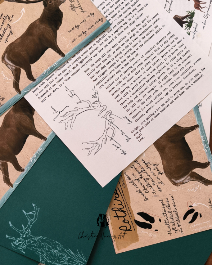 The letter comes in an specific coloured enveloped so you already get excited when getting a glimpse in your mailbox. In there is a letter that takes you far away and it is about 1-2 pages (A4) long. You will also find an art print of a hand-painted painting in it which will look like some kind of infographic about a specific animal but more like personal notes that have been out with Helena during her fieldwork. It is supposed to have a ruggished look. 15 x 20 cm on 200 gsm paper.